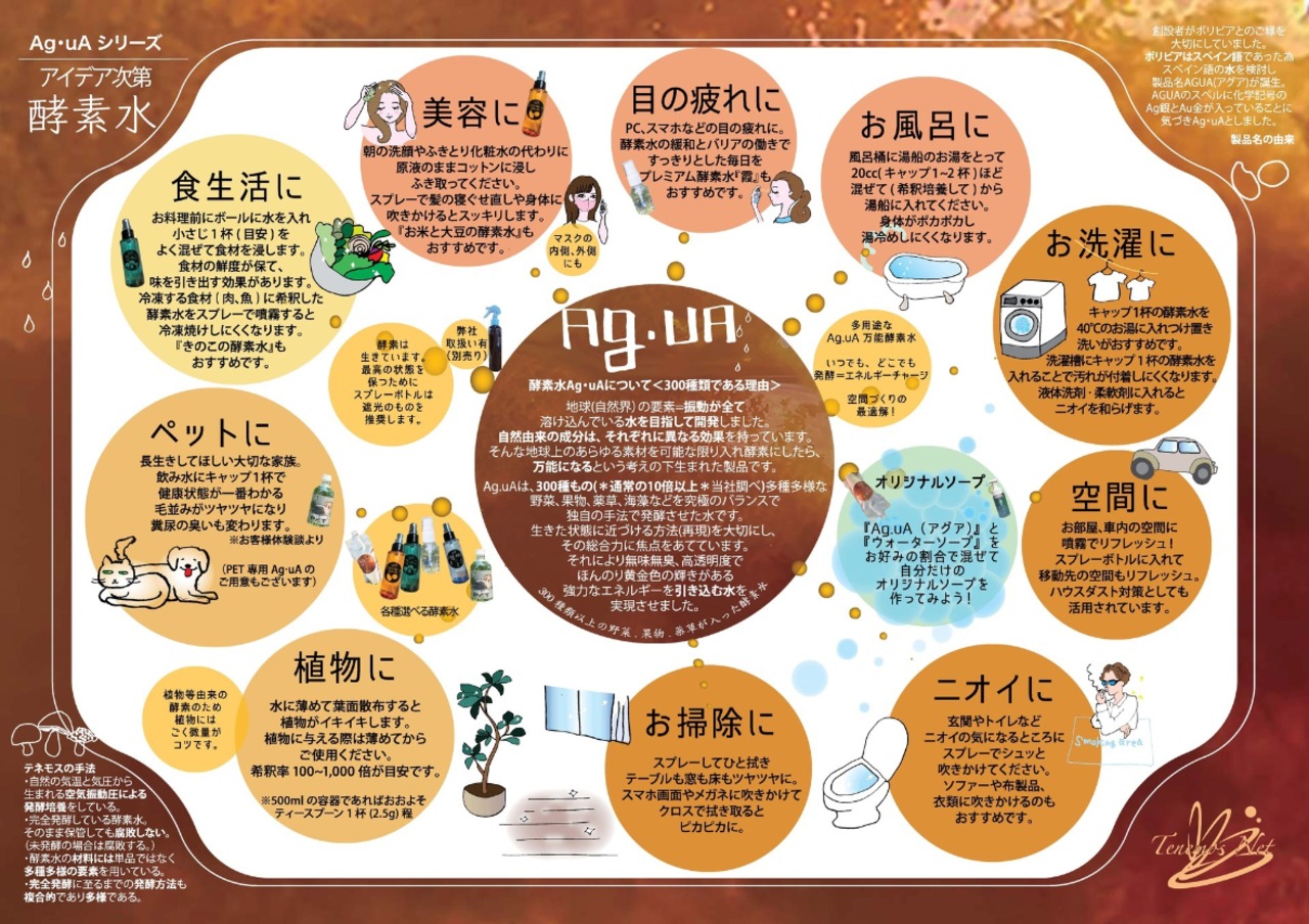 Ag・uAは300種類以上の野菜、果物、薬草、海藻等でつくられた無味無臭の万能活性酵素水です。